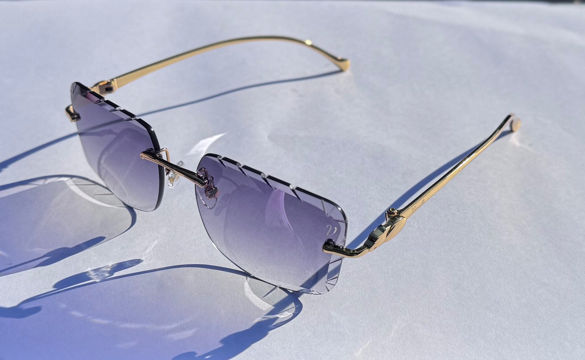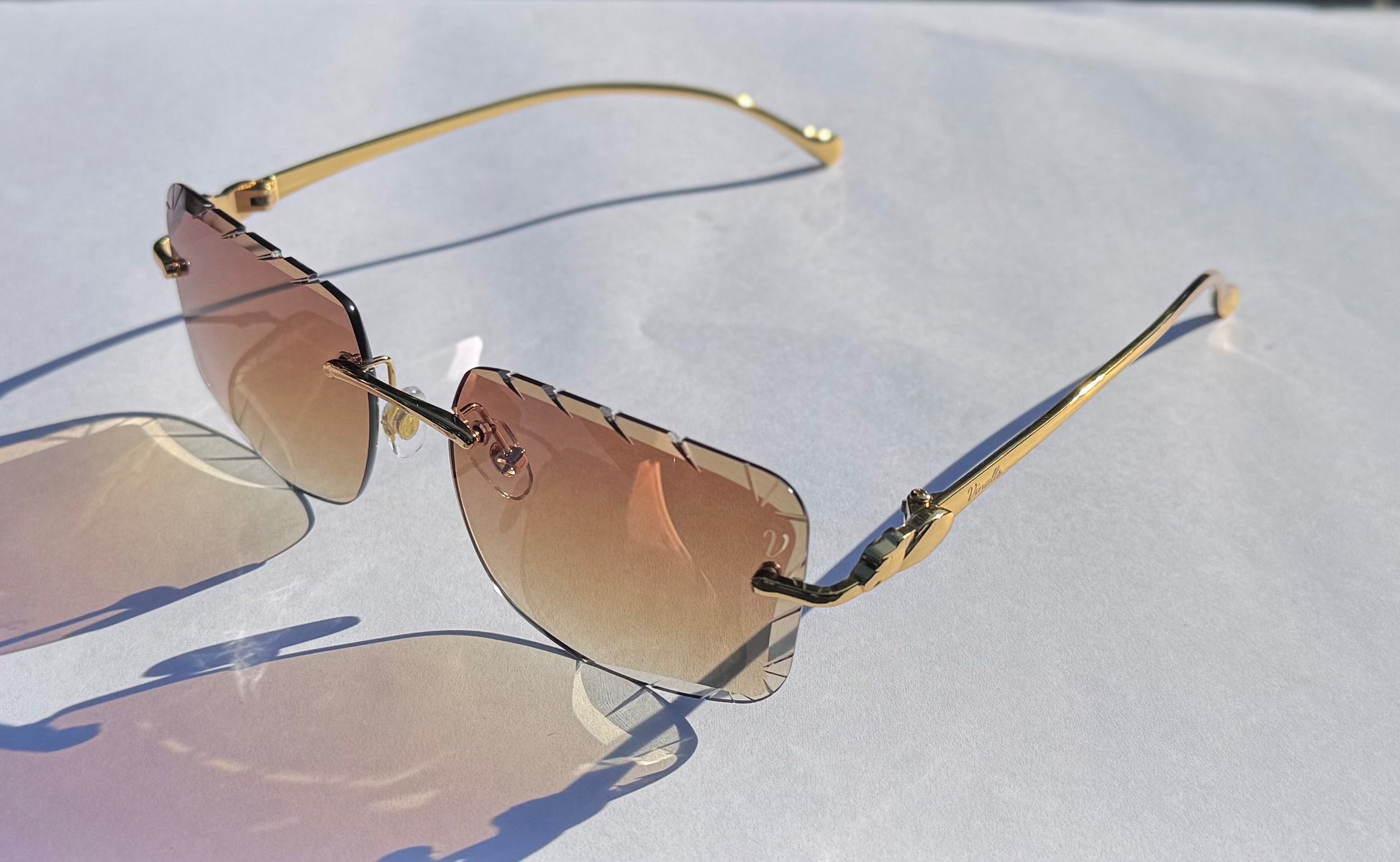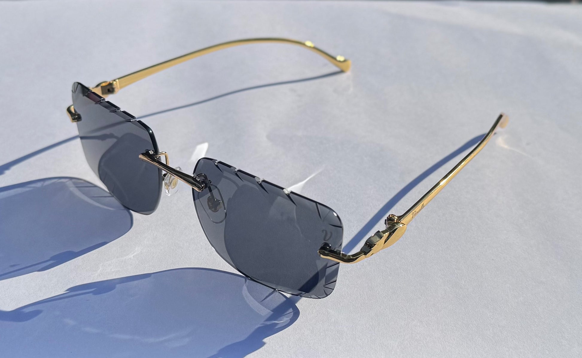 The Genie sunglasses feature sleek gold arms designed to comfortably slide onto your head without tangling in your hair. Crafted with cut lenses and beveled sides, they combine both style and comfort for a sophisticated look.