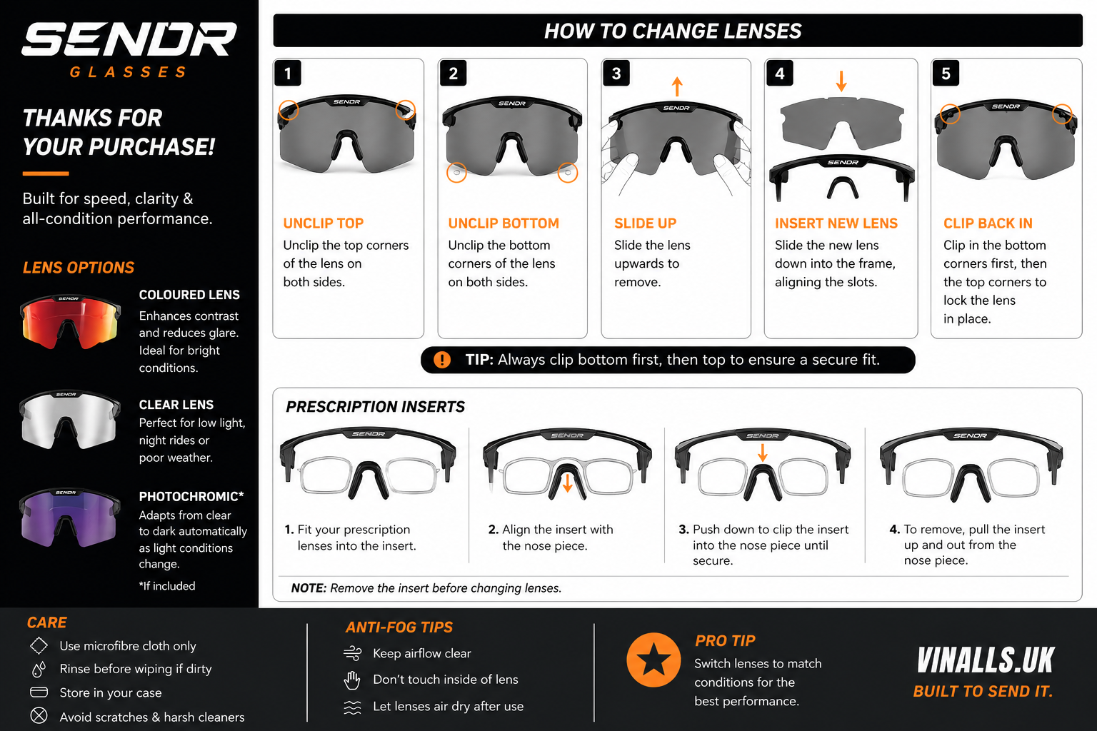 Your SENDR Glasses are built for speed, clarity, and all-condition performance—ready for every ride and run.